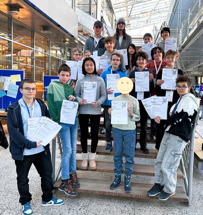 Die Schüler Sebastian Siewert (9d) (Wettbewerbssparte Arbeitswelt) und Vincent Engelbrecht (Q12/G8) (Wettbewerbssparte Technik) sowie Pauline Rieger (Q12/G8) (Wettbewerbssparte Biologie) haben beim Regionalwettbewerb Jugend forscht am 18. und 19. Februar 2025 an der THI jeweils einen ersten Preis erhalten. Sie haben sich damit für den Landeswettbewerb vom 2. bis 4. April 2025 qualifiziert.