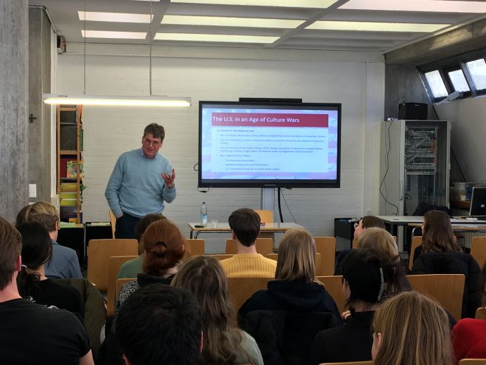 Prof. Depkat hielt vor interessierten Lehrkräften sowie Schülerinnen und Schülern der Oberstufe einen hoch interessanten Vortrag zum Thema "Cultural Wars and the Erosion of a Democratic Consensus in the US since the 1960s".