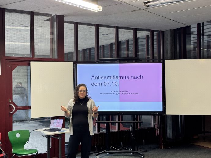 Die israelische Bloggerin, Politikanalystin und Buchautorin Jenny Havemann stand den Schülerinnen und Schülern verschiedener Ingolstädter Schulen bei einem Vortrag am Katharinen-Gymnasium am Donnerstag, den 13. März 2025 zu allen Fragen Rede und Antwort.