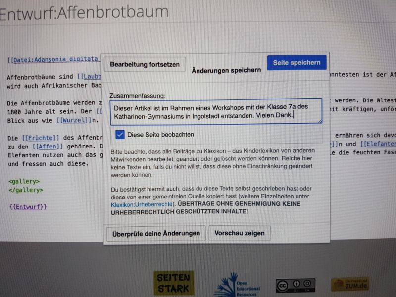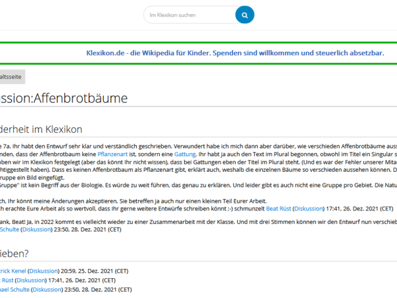 So konnten mit Hilfe der 7a manche Artikel aktualisiert werden, z. B. über den aktuellen Formel 1- Weltmeister Max Verstappen oder über die Videospiele Minecraft und Fortnite, vor allem aber konnte eine erste Version eines Lexikoneintrags zum Begriff „Affenbrotbaum“ erstellt werden – ein erster Entwurf –, der dann, wie bei Wikipedia üblich, zur Diskussion gestellt und kritisch analysiert wurde, wie man am folgenden Beitrag von Beat Rüst erkennen kann: