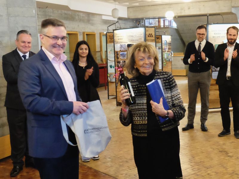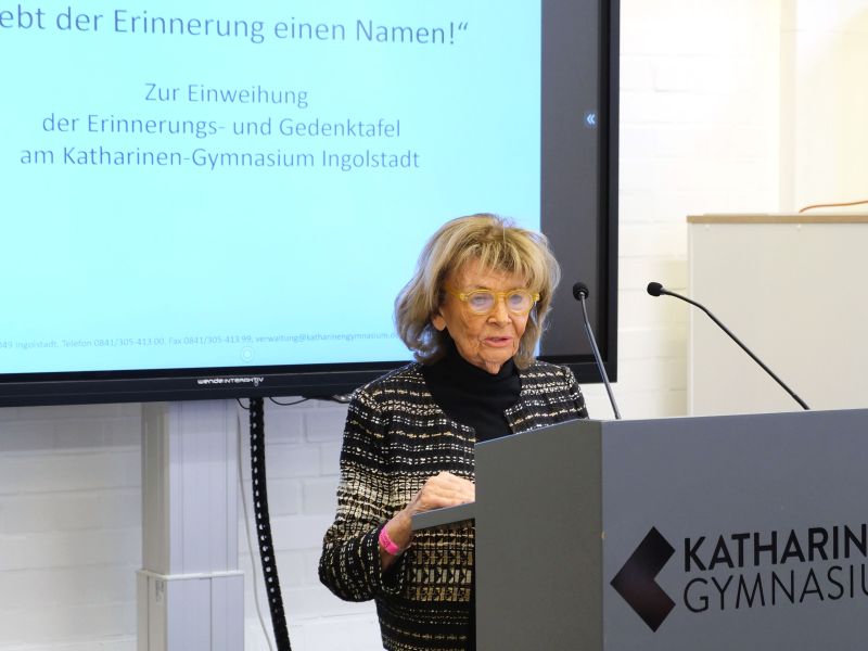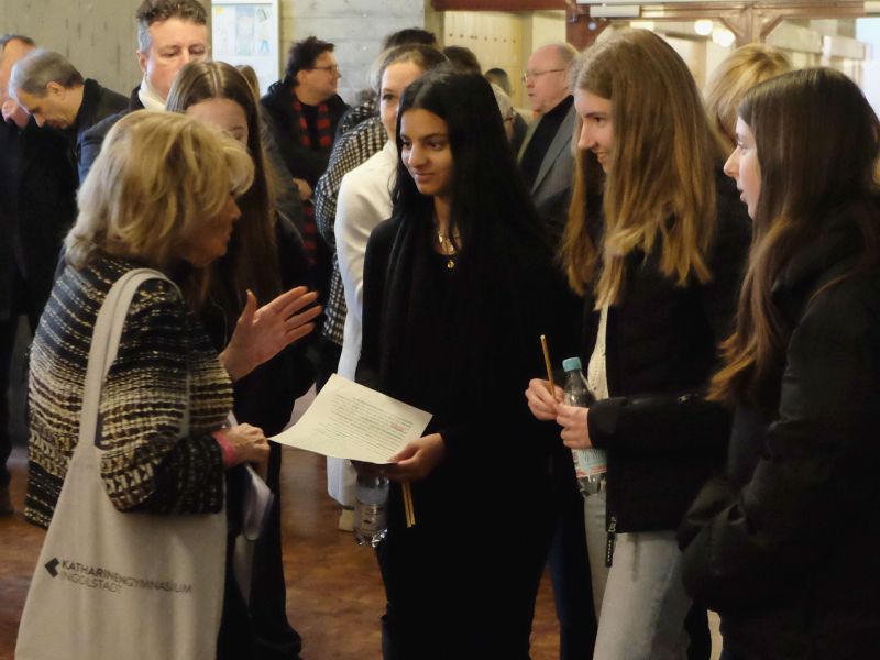 An diesem symbolträchtigen Termin, auf den Tag genau 90 Jahre nach Hitlers so genannter "Machtergreifung" am 30. Januar 1933, freuten wir uns neben der Schar Ingolstädter Ehrengäste mit OB Christian Scharpf an der Spitze vor allem darüber, dass auch Charlotte Knobloch, die Präsidentin der Israelitischen Kultusgemeinde von München und Oberbayern und ehemalige Präsidentin des Zentralrats der Juden in Deutschland, wieder ans Katherl gekommen war. In ihrer Rede rief sie vor allem die SchülerInnen dazu auf, niemals müde zu werden, die Erinnerung an die Opfer von Terror, Diskriminierung und Ausgrenzung aufrecht zu erhalten. Die vielen Facetten der jahrelangen Erinnerungsarbeit am Katharinen-Gymnasium sowie die engagierten Jugendlichen und auch Lehrkräfte, die sie bei ihren Besuchen an der Schule immer wieder erlebt habe, stimmen sie aber hoffnungsvoll.