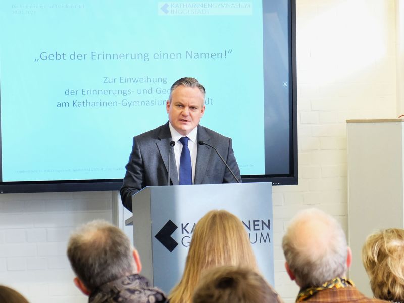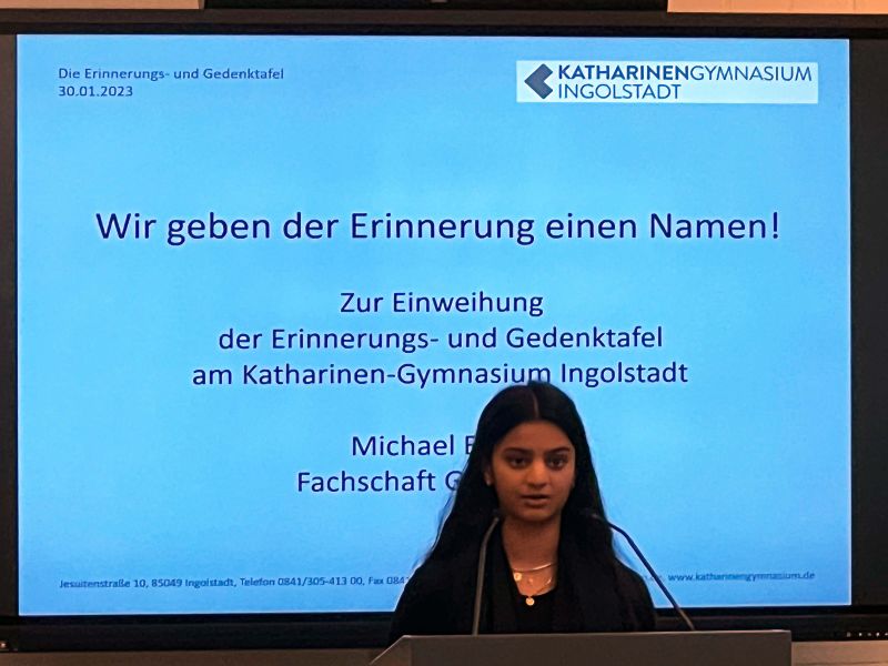Am 30. Januar 2023 wurde feierlich die Gedenktafel eingeweiht, mit der die Schulgemeinschaft des Katharinen-Gymnasiums stellvertretend für alle Opfer der nationalsozialistischen Terrorherrschaft an die vielen Zeitzeugen erinnert, welche die Schule in den letzten Jahren und Jahrzehnten besucht und unsere SchülerInnen mit ihren Berichten tief bewegt und beeindruckt haben.