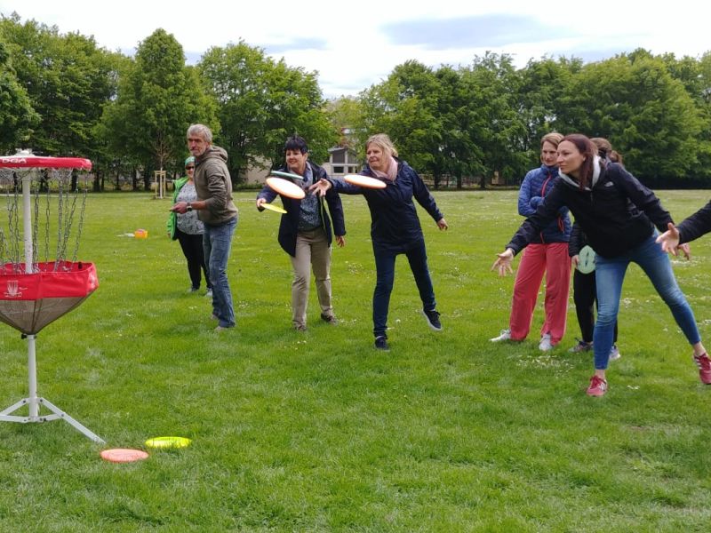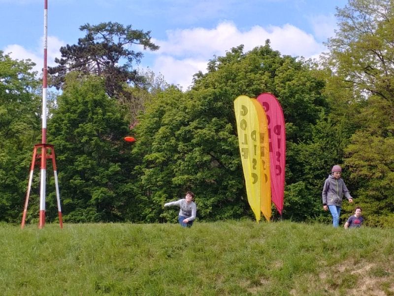 Am Vormittag kamen drei Klassen aus drei verschiedenen Schulen, die sich nach einer kurzen Einführung auf dem Parcours austoben konnten. Am Nachmittag absolvierten interessierte Lehrkräfte zuerst ein recht ausführliches Techniktraining - von physikalischen Erklärungen des Scheibenfluges bis zur DiscGolf-Etikette - von Michael Kobella. Nicht jedem gelang es dabei auf Anhieb, die Scheibe, wie demonstriert, 120 Meter weit zu werfen, aber jeder hat es zumindest versucht. Anschließend spielten auch die Lehrer eine Runde mit dem Meister und durften feststellen, dass diese Sportart eine ganz eigenartige Mischung aus Spaß, Frustration und Motivation bietet.