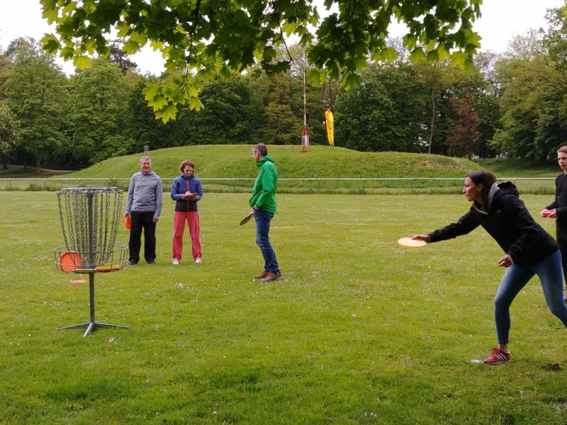 Am Mittwoch, den 15.5.2019 wurde von der DiscGolf-Gruppe des Katherls ein Workshop im Hindenburgpark durchgeführt. Dazu kam aus Augsburg der mehrmalige Deutsche Meister und Amateurweltmeister von 2017 und 2018 Michael Kobella. Gemeinsam bauten wir einen Kurs mit sieben abwechslungsreichen Bahnen auf, um Schülern und Lehrkräften von Ingolstädter Schulen die Möglichkeit zu geben, diesen in Ingolstadt noch relativ neuen Trendsport (Was ist DiscGolf?) einmal in natürlicher Umgebung auszuprobieren.