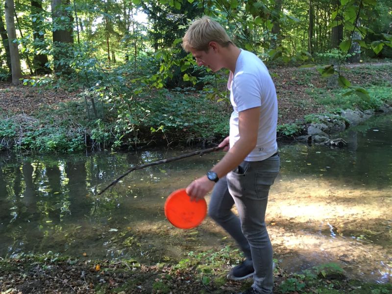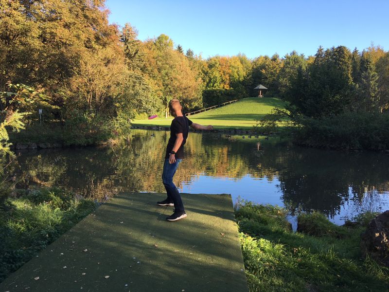 Umso schöner war es, bei blauem Himmel und bestem Discgolfwetter endlich loslegen zu können. Ein paar Probeputts, einige Testdrives und schon fanden wir uns auf dem schwierigen WaldWiesenWasserkurs wieder. An der zweiten Bahn durften wir bereits die erste Scheibe aus einem Bach bergen und im Lauf der ganzen Runde passierten in regelmäßigen Abständen unsägliche Missgeschicke. Vier Scheiben kamen nicht mehr freiwillig von irgendwelchen Bäumen herunter und an Bahn 13 verwandelte sich die ganze Angelegenheit ziemlich eindeutig in eine mudrace-ähnliche Veranstaltung, mehr soll hier gar nicht verraten werden. Immerhin gelang es uns trotz weiterer Scheibenversenkungsmaßnahmen alle Discs wieder aus den Tümpeln und Bachläufen zu holen. Manch ein Spieler konnte aus lauter Angst vor den riesigen Wasserflächen gar nicht mehr geradeaus werfen, während andere Spieler auch ohne Wasser nicht geradeaus warfen. Am Ende stand immerhin bei jedem von uns eine neue Bestleistung zu Buche, aber wir wissen auch, was noch ALLES zu üben ist, damit es beim nächsten Mal noch mehr Spass macht.