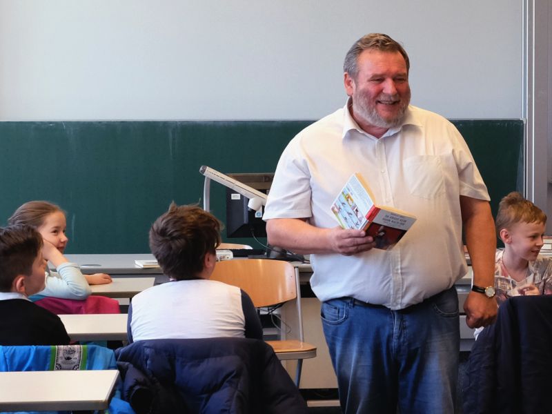 Aus dem Band mit eben diesem Titel sowie aus anderen Bänden der bekannten Comic-Roman-Reihe „Seppis Tagebuch“ stammten die Kostproben, die der Autor seinem begeisterten Publikum gab. Mit Humor, schauspielerischem Einsatz und viel Interaktion mit den Zuhörern, von denen einige echte „Seppi“-Fans und -Experten waren, stellte Hans-Peter Schneider das Leben seiner Titelfigur Seppi vor. Im anschließenden Gespräch reichte die Zeit kaum für all die Fragen, die die Fünftklässler an den bekannten Autor richten wollten. Ihre Neugier wurde schließlich auch dahingehend gestillt, dass es mit „Seppi“ in einem neuen, mittlerweile siebten Band demnächst weitergehen wird.
