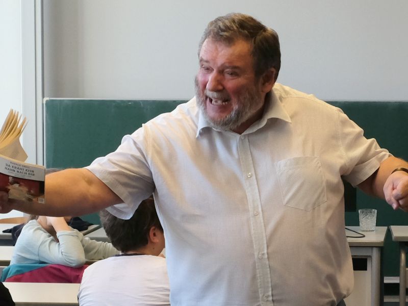 Harald Grill stammt aus der Oberpfalz, ein Heimatdichter ist er aber nur in einem ganz speziellen Sinn. Am 16. Februar kam der Fleißer–Preisträger von 2003 auf Einladung der Fachschaft Deutsch zu uns ans Katherl, um einen wahren Marathon zu bewältigen. Zunächst präsentierte er vor den versammelten Oberstufenschülern der Q11 sein jüngstes Reiseprojekt, das ihn „hinter drei Sonnenaufgängen in eine andere Welt” führte, und zwar nach Rumänien, Bulgarien und in die Ukraine; ein bei uns eher unbekanntes Stück Europa, das aber gerade in seiner Fremdartigkeit umso faszinierender schillert, besonders wenn es von Grill in seiner unnachahmlich verschmitzten Art plastisch, bunt und nahe an den Menschen, auf die er immer wieder trifft, beschrieben wird. Mit neugierigen Blicken zog er über den Balkan, nahm sich viel Zeit für Land und Leute und ließ, wie er selbst sagt, die „Beschleunigung, die Rennerei, die Hetzerei” unseres Alltags hinter sich. Im zweiten Teil des Vormittags erlebten wir dann, wie geschwind und unnachahmlich sich der Autor auf eine nun ganz andere Zuhörerschaft einstellen kann, denn jetzt kamen unsere „Kleinen”, die gesamte 5. Jahrgangsstufe, in den Genuss einer wahren Performance – Grill demonstrierte den Schülerinnen und Schülern, wie er selbst Bücher schreibt, und zwar anhand seines bekannten Jugendromans „Da kräht kein Hahn nach dir”, der von Bernd erzählt, der nach einem Unfall seines Vaters mit seiner Familie vom Land in die Stadt ziehen muss – anschaulich ist das, so richtig lustig, aber auch mal nachdenklich – die jungen Leute waren begeistert, viele, die das Buch noch nicht kennen, wollen es lesen, am liebsten sofort. Eine Pause gönnte sich Grill auch zwischen den beiden Auftritten nur bedingt, denn da stellte er sich den vielfältigen Fragen der Schülerzeitung und sprach mit den beiden Redakteuren, übers Schreiben, seine Familie, sein Leben auf dem Land, die Zeit des Widerstands gegen die WAA in Wackersdorf und vieles mehr. Beim Schreiben geht es ihm, so Grill, darum, sich selbst einen Überblick zu verschaffen. Gedichte und Geschichten würden gewiss nicht gleich die Welt verändern, aber uns selbst schon, wenn wir es zulassen.