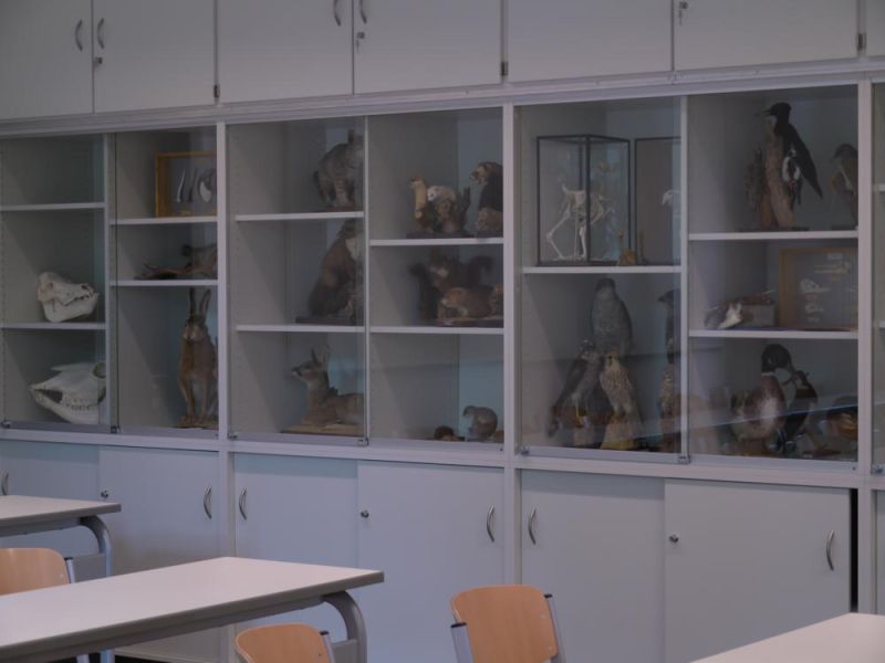 Alle Objekte unserer sehr reichhaltigen Sammlung waren bisher für Schülerinnen und Schüler unzugänglich in den Vorbereitungsräumen aufbewahrt. Nun ist ein großer Teil davon in Schränken mit Glastüren in den Unterrichtsräumen ausgestellt, so dass die Möglichkeit besteht, in den Zeiten vor oder nach dem Unterricht diese Ausstellungsstücke zu betrachten, wovon – sehr zur Freude der Biologie–Lehrkräfte – rege Gebrauch gemacht wird.