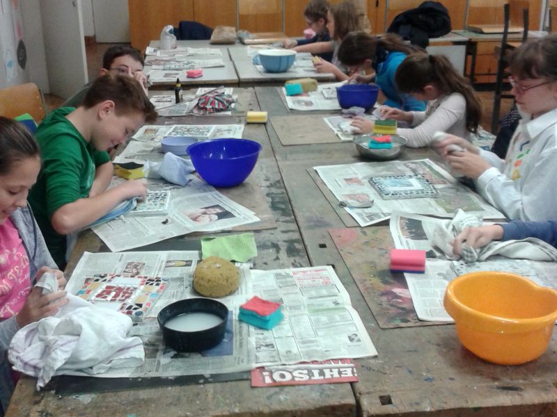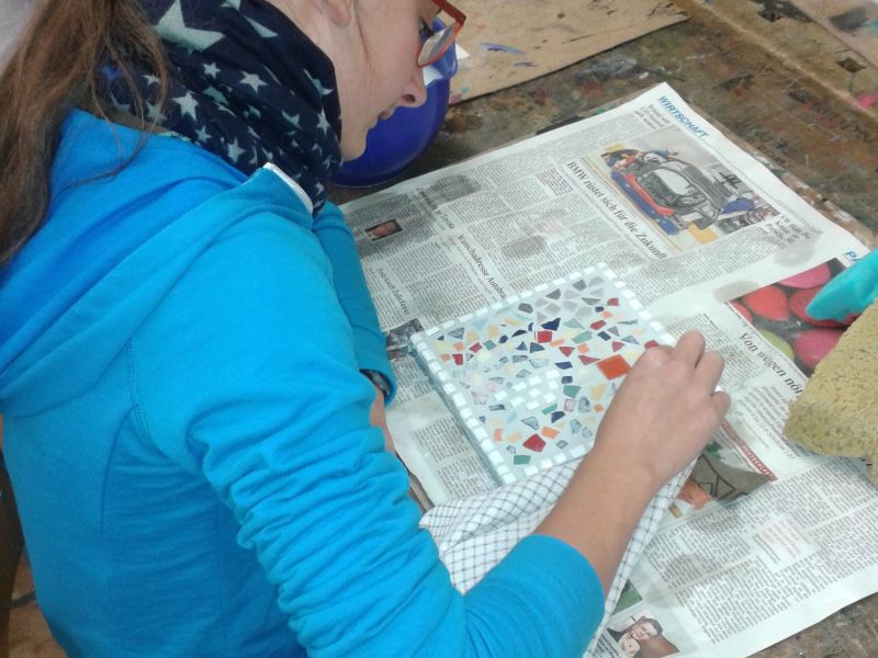 Das griechische „mousa”, also „Muße” oder „Kunst” ist der Ursprung unseres Wortes „Mosaik” – genau diese Kunst praktizierten die Teilnehmer des Schülerakademiekurses „Geschichtswerkstatt” in den vergangenen Wochen. Zunächst wurden Fliesen mit Hilfe von Hammer und Zange zerkleinert und passgenau zugeschnitten. Dann konnte das Motiv gelegt und auf passenden Untergrund aufgeklebt werden. Nach einer Trocknungsphase erfolgte das Verfugen und Polieren. Auch wenn die Arbeit mühsam, staubig und anstrengend war, waren am Ende alle stolz auf ihr Kunstwerk – und betrachten die Mosaike der römischen, griechischen und byzantinischen Antike nun sicherlich mit umso größerem Respekt!