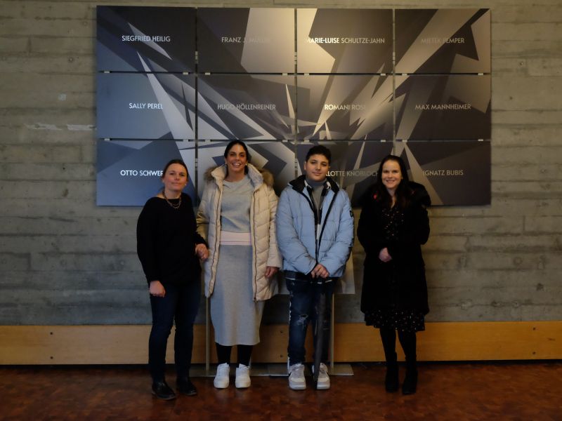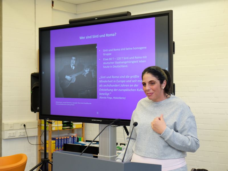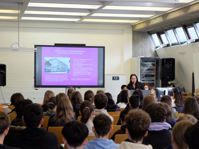 Am 26. Januar 2024 hielt Frau Agnes Krumwiede anlässlich des Internationalen Holocaust-Gedenktages für alle neunten Klassen einen Vortrag über den Völkermord an den Sinti und Roma und über die Kontinuität der Verfolgung nach 1945. Sie wurde dabei von Angehörigen der Familie Höllenreiner begleitet.