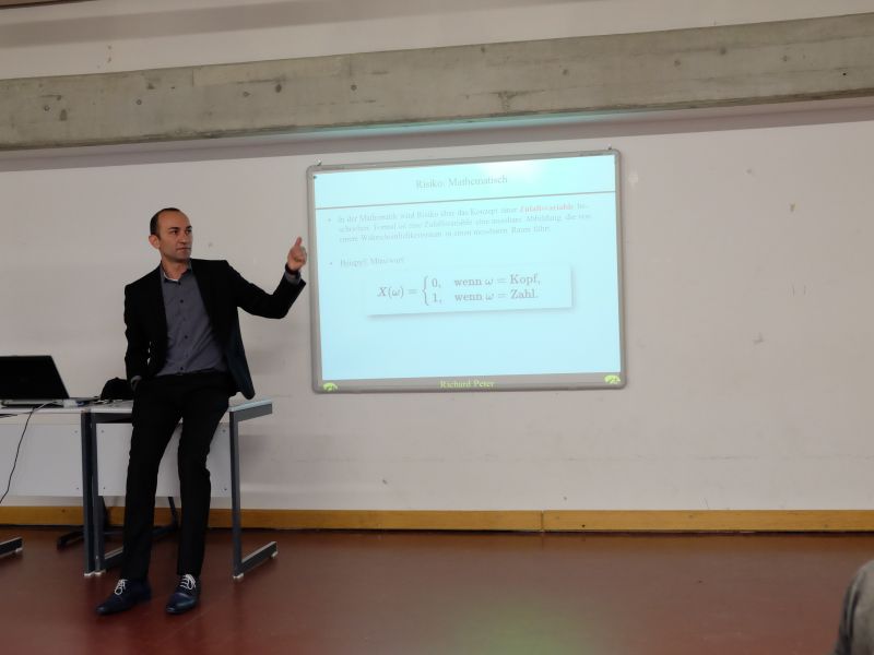 Am 17. Juni besuchte uns Prof. Dr. Richard Peter, der 2004 vom Katharinen-Gymnasium den Sprung ans Maximilianeum schaffte und an der LMU München Mathematik studierte. Nach seiner Promotion wurde er schon im Alter von 29 Jahren Juniorprofessor an der LMU, inzwischen lebt er in den USA und ist Assistant Professor am Department of Finance der Universität Iowa. Ein Schwerpunkt seiner Forschungen liegt im Risikomanagement. Darunter versteht man sämtliche Maßnahmen zur systematischen Erkennung, Analyse, Bewertung, Überwachung und Kontrolle von Risiken. Um das Thema Risiko ging es auch bei seinem Vortrag „Zwo, Eins, Risiko – Entscheidungsverhalten unter Unsicherheit, ein mathematisches Problem?” In wichtigen Bereichen der angewandten Mathematik spielt Risiko eine zentrale Rolle, z.B. in der Statistik und in der Finanzmathematik (Kapitalmarkttheorie, Modellierung von Zinsen). Auch in anderen Bereichen ist Risiko von Bedeutung, etwa in den Wirtschaftswissenschaften (unternehmerisches Risiko), der Entscheidungstheorie (Einfluss von Risiko auf Entscheidungsverhalten) und in der Psychologie (Risikowahrnehmung). Bereits das erste Beispiel, das berühmte St. Petersburg–Paradoxon, war sehr interessant und lehrreich. Hier geht es um ein Spiel, bei dem eine Münze geworfen wird. Ist das Ergebnis beim 1. Wurf „Kopf”, so erhält der Spieler 1 € und das Spiel ist beendet. Falls nicht, wird nochmals geworfen. Erscheint nun „Kopf”, gibt es 2 € und das Spiel ist aus. Ansonsten wird wieder geworfen und bei „Kopf” werden 4 € ausbezahlt. Bei „Zahl” wird die Münze wieder geworfen und als Gewinn winken 8 €, dann 16 € usw. Der Referent fragte, welchen Betrag die Zuhörer bei einem solchen Spiel als Einsatz leisten wollten. Bei dem Spiel können Millionen von Euro gewonnen werden, allerdings mit einer winzigen Wahrscheinlichkeit. Fällt z.B. erst nach 25 Würfen „Kopf”, so ist der Gewinn 224, das sind fast 17 Millionen. Die Wahrscheinlichkeit dafür ist mit 0,525 sehr klein (etwa 0,00000003). Erfahrungsgemäß würde kaum jemand mehr als 10 € Einsatz riskieren, obwohl der Erwartungswert des Gewinns unendlich groß ist.