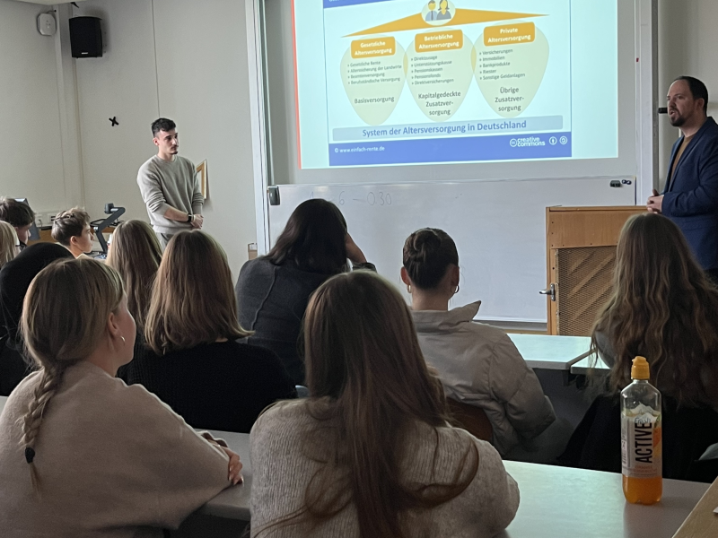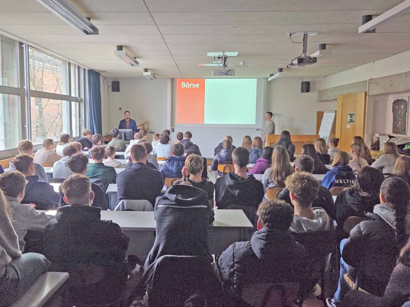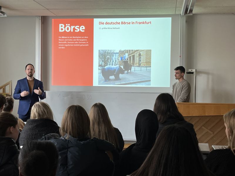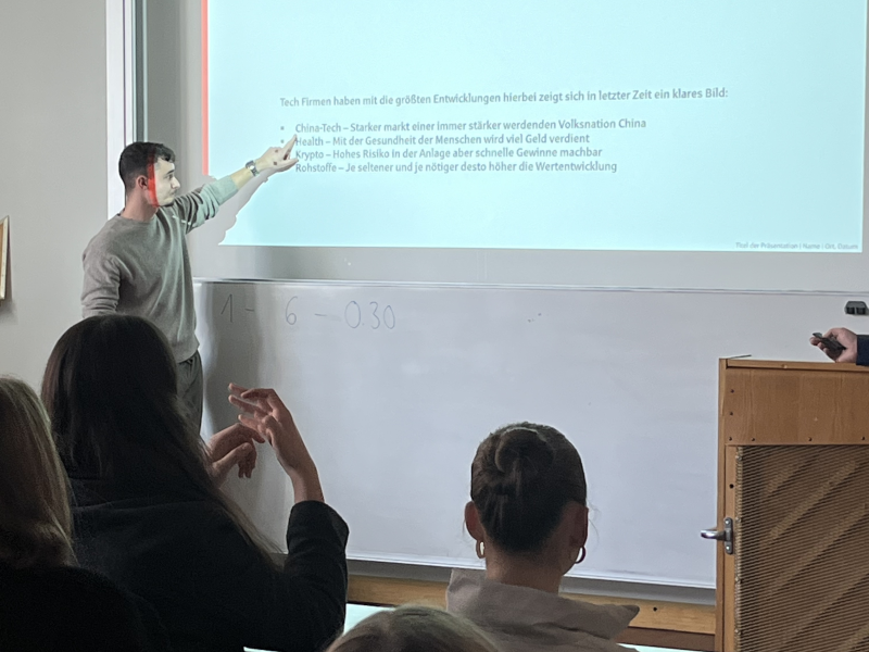 Damit unsere Schüler einen noch tieferen Einblick in die Thematik erhalten, besuchten uns am 18. November 2025 Herr Zach und Herr Brazzale von der Sparkasse. In einem Impulsvortrag erfuhren die Schüler was Wertpapiere sind, wieso diese für die private Altersversorgung in Zukunft einen hohen Stellenwert haben und welche Trends gerade auf dem Aktienmarkt herrschen.