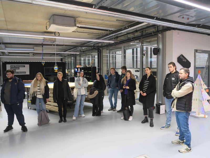 Im Untergeschoss des brigk befindet sich der Makerspace, der in mehrere Räume unterteilt ist.  Im Rapid Prototyping Bereich stehen zahlreiche Maschinen - vom  Lasercutter, über einen 3D-Drucker bis hin zur Fräsmaschine - zur Verfügung, welche die Erstellung von Werkstücken und Prototypen preisgünstig ermöglichen. Max Hofedank erklärte uns, dass der Lasercutter das beliebteste Gerät dieses Bereiches ist. Hier kann man aus verschiedenen Materialien Objekte herstellen. Im Vergleich zum 3D-Drucker bietet der Lasercutter den Vorteil, dass innerhalb von fünf Minuten ein Objekt hergestellt werden kann. Mit einer Schnittstärke von 0,1 mm ist es beim Lasercutter möglich, nahezu identische Replikate herzustellen.