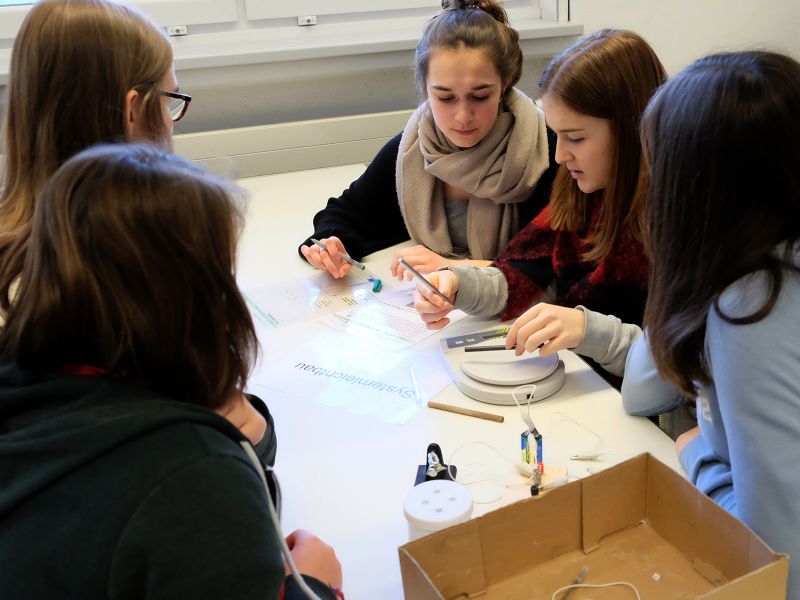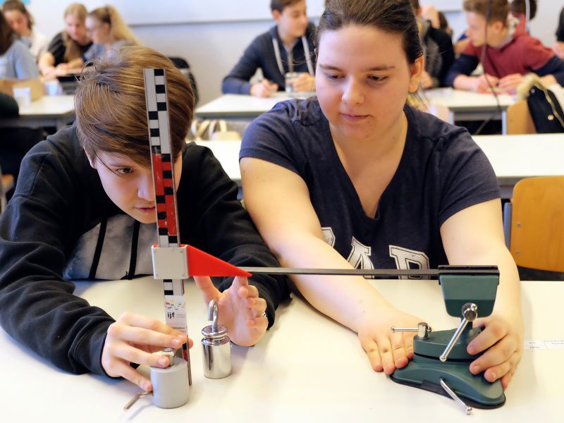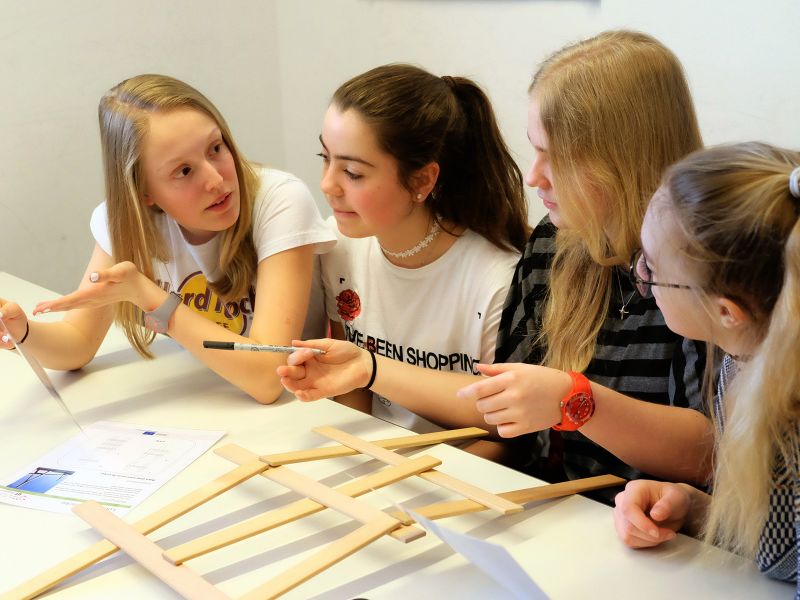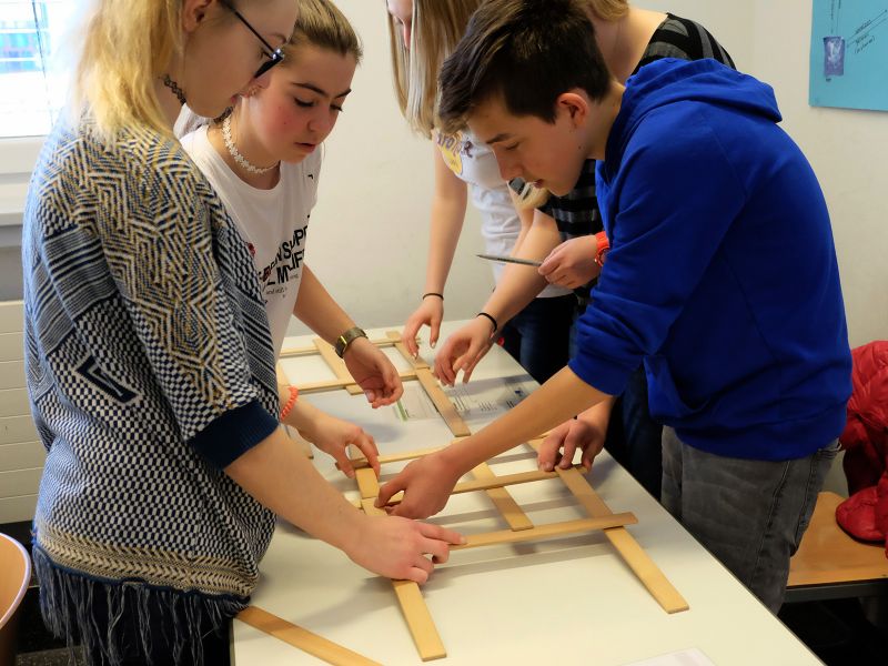 Anschließend konnten die Schülerinnen und Schüler an verschiedenen Lernstationen ihr neu erworbenes Wissen vertiefen und anwenden. In Gruppenarbeit wurde dann aus 10 Blatt DIN-A4 Papier und einer Rolle Tesafilm eine Brücke gebaut, die den Anspruch haben sollte möglichst leicht zu sein und eine große Tragkraft zu haben. Das beste Team baute eine Brücke mit einer Spannweite von 30 cm, einem Brückengewicht von nur ca. 35 Gramm, die eine Masse von erstaunlichen 3,0 kg tragen konnte.