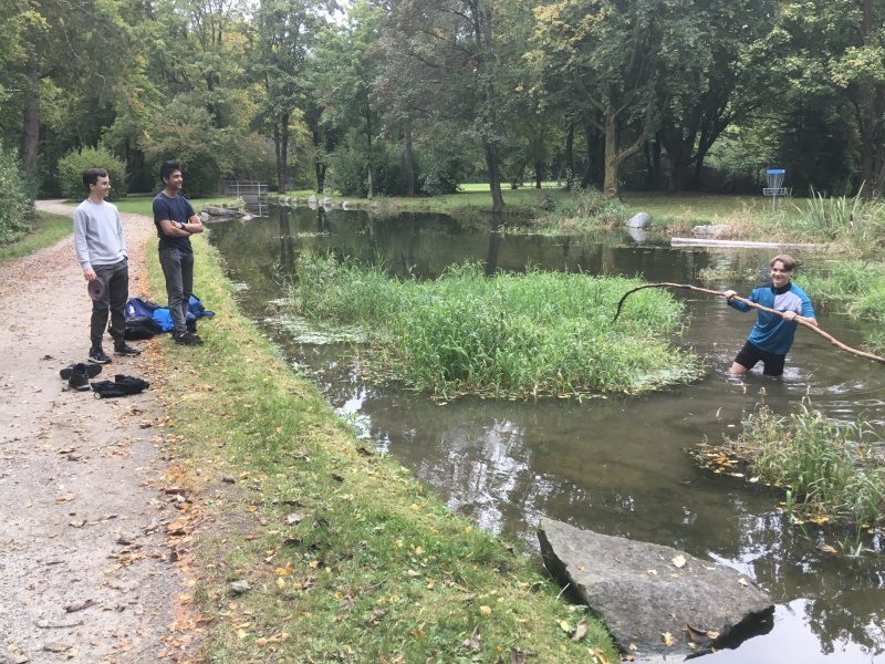 Nach dem Turnier spielten wir zum Ausklang im doch recht "wasserlastigen" Park noch ein paar Bahnen. Das ziemlich risikoreiche Konzept "waterskip" war einigen der Jungs besonders am Herzen gelegen. Nur schade, dass Discgolfscheiben nicht schwimmen. So führte der Spaß auch prompt zu mehreren Scheibenverlusten. Aber keine Angst, überaus eindringliche Überredungskünste führten letztendlich doch noch zur Bergung der Tiefseeobjekte. Und ja, das Wasser war nicht nur "nicht warm"... (siehe Bild)