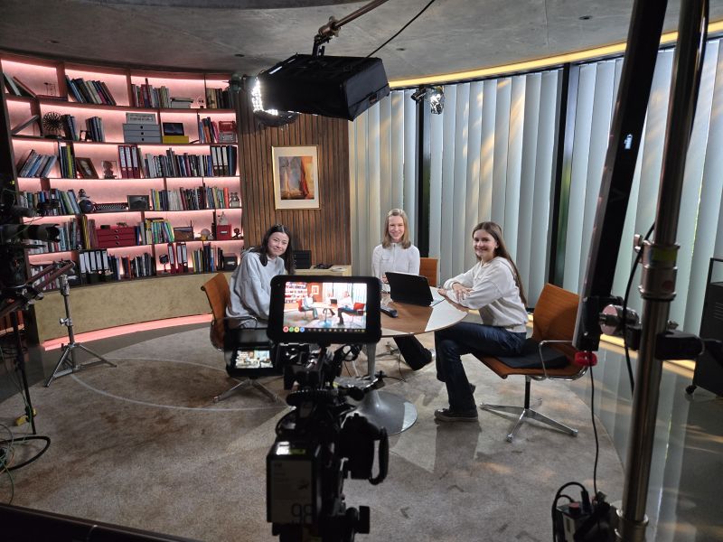 Zunächst gab es einleitende Worte der beiden Chefinnen, Eva Schiller und Eva Ingold, und ein Einführungsvideo. Weil wir aufgeteilt wurden, variieren die einzelnen Erfahrungen. Die Gruppe 1A, von der ich Teil war, wurde von der technischen Leitung des Studios begleitet und durfte mittels bereitgestellter Materialien ein Reel zum Thema Handyverbot an Schulen erstellen. Wichtige Grundsätze waren dabei Objektivität, Verständlichkeit und Korrektheit der Fakten. Zudem zählte die Besichtigung des Drehortes der Harald-Lesch-Show zu den Highlights unserer Exkursion. Ebenfalls beeindruckend war die Simulation eines Interviews mit verteilten Rollen: Es gab Reporterinnen und Reporter, Interviewte, Tonbeauftragte, Kamerafrauen und -Männer sowie Cutter und Cutterinnen; hier wurde ebenfalls die aktuelle sowie kontroverse Thematik der eingeschränkten Nutzung von Smartphones an Schulen aufgegriffen, die aufgrund der Handy-Garagen am Katherl auch uns persönlich betrifft. Abschließend hatten wir die einmalige Gelegenheit, uns per Videokonferenz mit den Auslandskorrespondenten Elisabeth Schmidt in Peking (Studio Ostasien) und Ulf Röller aus Brüssel (EU- und Benelux-Studio) auszutauschen. Auf humorvolle und ehrliche Weise erzählten sie von den Schwierigkeiten und Opfern dieses Berufs, von ihrer Leidenschaft für diese Tätigkeit und den Problemen, mit denen der Journalismus heutzutage konfrontiert ist. Letzterer schloss mit dem eindringlichen Appell an unsere Generation, sich nicht mit kurzen Reels über komplexe Sachverhalte abspeisen zu lassen und kritisch zu hinterfragen, weil das eines der Kernelemente der Demokratie ist.