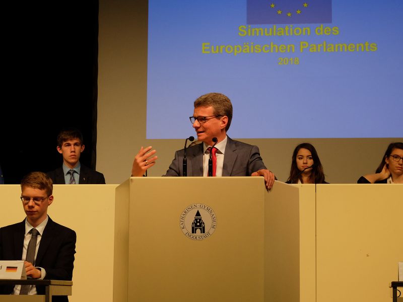 Bereits zum 15. Mal fand am Do., den 19.4.2018 eine Simulation einer Sitzung des Europäischen Parlaments am Katherl statt. Als Ehrengäste durften wir Kultusminister Bernd Sibler und den Oberbürgermeister Ingolstadts, Dr. Christian Lösel, begrüßen. Zur Eröffnung der Sitzung betonte der Kultusminister: „Das Simulationsspiel zum Europäischen Parlament ist in vielerlei Hinsicht ein bemerkenswertes Beispiel für politische Bildung an Bayerns Schulen: Unsere Schülerinnen und Schüler können unmittelbar erleben, wie Politik in Europa funktioniert. Sie erhalten einen Einblick in die Fülle an Themen, die auf europäischer Ebene verhandelt werden. Das Projekt bietet die Chance, sich der Bedeutung Europas und demokratischer Prozesse bewusst zu werden. Das ist eine zentrale Voraussetzung, um deren hohen Wert zu erkennen und sich für ein demokratisches Miteinander einsetzen zu können”.