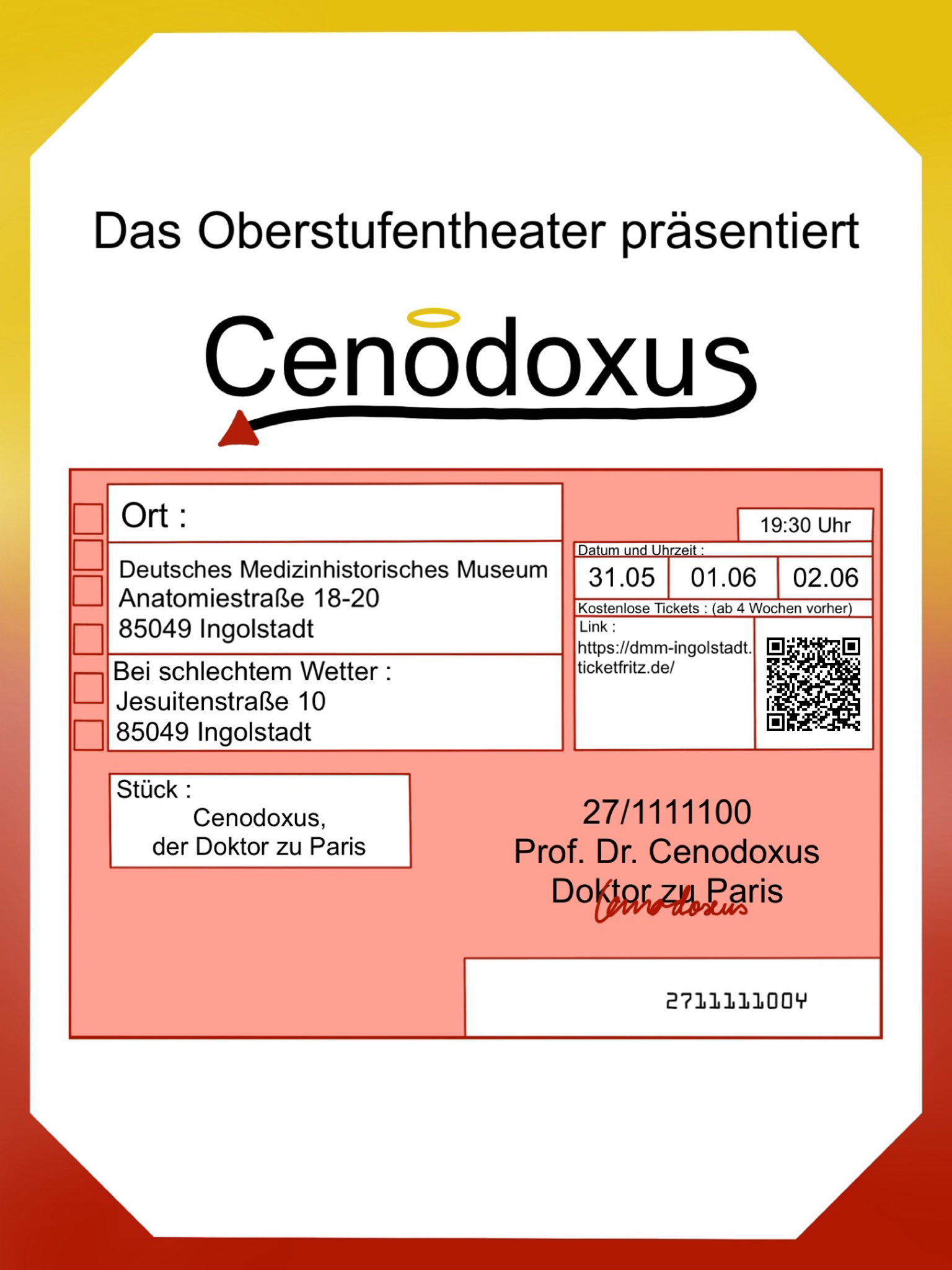 Wir freuen uns auf Sie und hoffen auf gutes Wetter, damit Sie das Stück am 31. Mai sowie am 1. und 2. Juni ab 19:30 Uhr in der fabelhaften Kulisse des Anatomiegartens des Deutschen Medizinhistorischen Museums (Anatomiestraße 18-20, 85049 Ingolstadt) genießen können. Bei schlechtem Wetter müssten wir in die Sporthalle des Katharinen-Gymnasiums ausweichen.