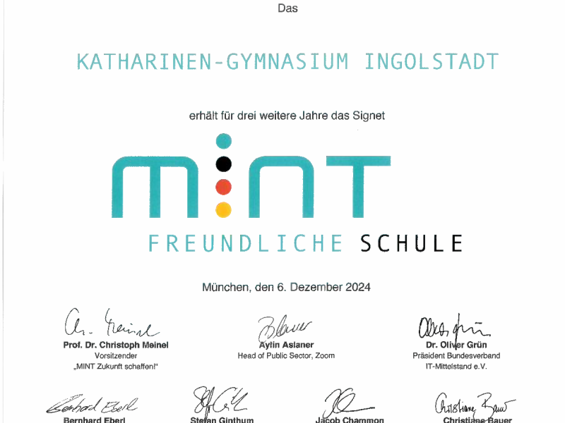 Am 6. Dezember 2024 erhielten 50 Schulen aus Bayern den Titel “Digitale Schule” und 86 Schulen den Titel “MINT-freundliche Schule”. Die Schulen wurden heute in den Münchner Räumen von Google Deutschland geehrt.  Das Katherl wurde erneut in beiden Bereichen geehrt.