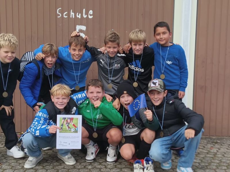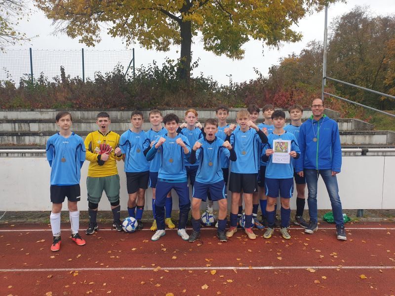 Ebenfalls mit der Bronze-Medaille um den Hals durften an gleichem Tag und an gleicher Stätte die Jungen III (Jahrgänge 2010/2009) zufrieden nach Hause fahren – und das ganz ohne Niederlage! Nach einem Sieg gegen das Reuchlin-Gymnasium (2:0) und zwei Unentschieden gegen das Christoph-Scheiner Gymnasium (1:1) und das Apian-Gymnasium (0:0) reichte es auch bei den etwas größeren Jungs zum „kleinen Finale“. Hier traf man auf die Gebrüder-Asam Mittelschule, welche nach einem dramatischen Spiel am Ende im Elfmeterschießen knapp besiegt werden konnte!