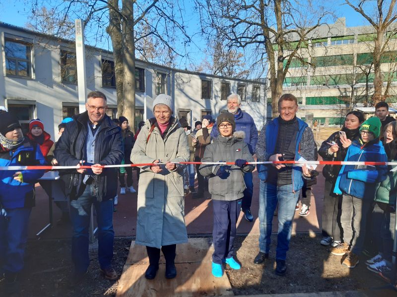 Frau Bürgemermeisterin Dr. Dorothea Deneke-Stoll ließ es sich denn auch nicht nehmen, zusammen mit unserem Schulleiter Dr. Matthias Schickel und unserem Sport-Fachleiter Harry Fuchs das Band zu unserer eigenen "Miniatur-Allianz-Arena" durchzuschneiden - bei strahlendem Sonnenschein und klirrend kalten Temperaturen.