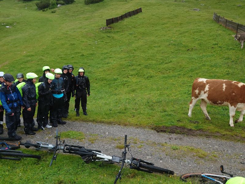 Somit kleideten wir uns alle mit unseren Regenklamotten ein und los ging es. Hauptsächlich bezwangen wir steile Schotterwege und kämpften uns die Serpentinen nach oben bis zur Sunnalm hoch über dem Fernpass. Dort angekommen trockneten wir unsere Klamotten, die trotz Abweisfunktion klitschnass waren.