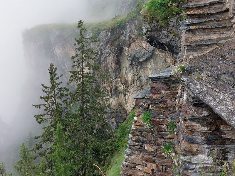 Aber nun mal etwas detaillierter: Früh morgens machten wir uns von Taufers auf den Weg, um das Val Müstair zu durchqueren und anschließend 1000 harte hm hinauf ins Val Mora zu bestreiten. Bis dahin war das wohl das anstrengendste Stück unserer gesamten Tour. Gleichzeitig war die Landschaft so einzigartig und wunderschön, dass unser Schmerz betäubte wurde und alles erreichbar erschien. Wasserfälle, reißende Gebirgsbäche, karge Felsformationen und Ausblicke in endlos erscheinende Tiefen machten uns das besondere unserer Reise bewusst.