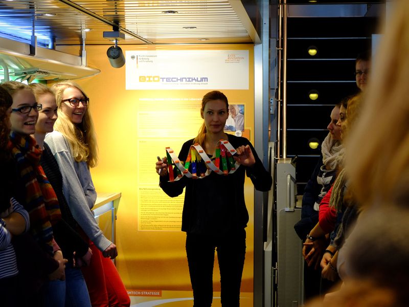 Das Kernstück der Initiative – die mobile Erlebniswelt BIOTechnikum – ist Labor, multimediale Ausstellung, Kino und Dialogforum zugleich. Besucherinnen und Besucher des doppelstöckigen Trucks (Länge: 16,5 m, Breite: 7,5 m, Höhe: 6,2 m, ca. 100 m2 Innenfläche) erhalten im Gespräch mit den drei projektbegleitenden Wissenschaftlern Informationen zu Grundlagen, Forschungs- und Anwendungsgebieten der Biotechnologie sowie Ausbildungs- und Karrierechancen in diesem Zukunftsfeld.