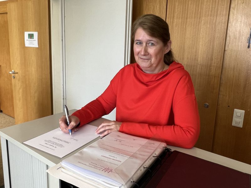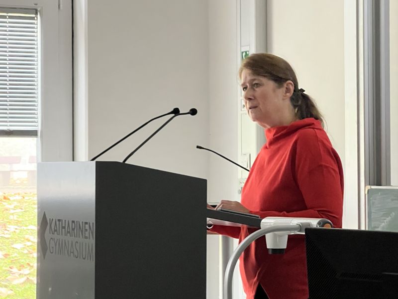 Im Anschluss an den Vortrag trug sich Frau Dr. Urban, mit der das Katharinen-Gymnasium schon seit gut 10 Jahren in vielerlei Kontexten eng und fruchtbar kooperiert, in das „Goldene Buch“ der Schule ein.