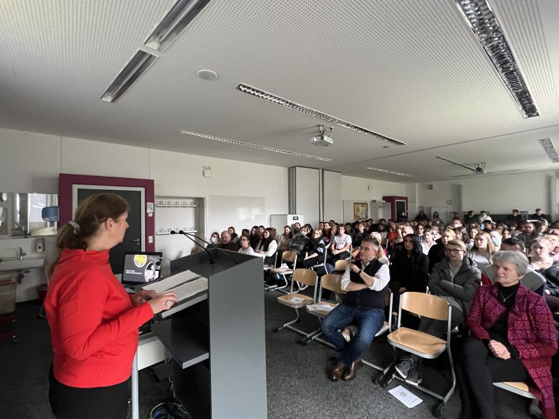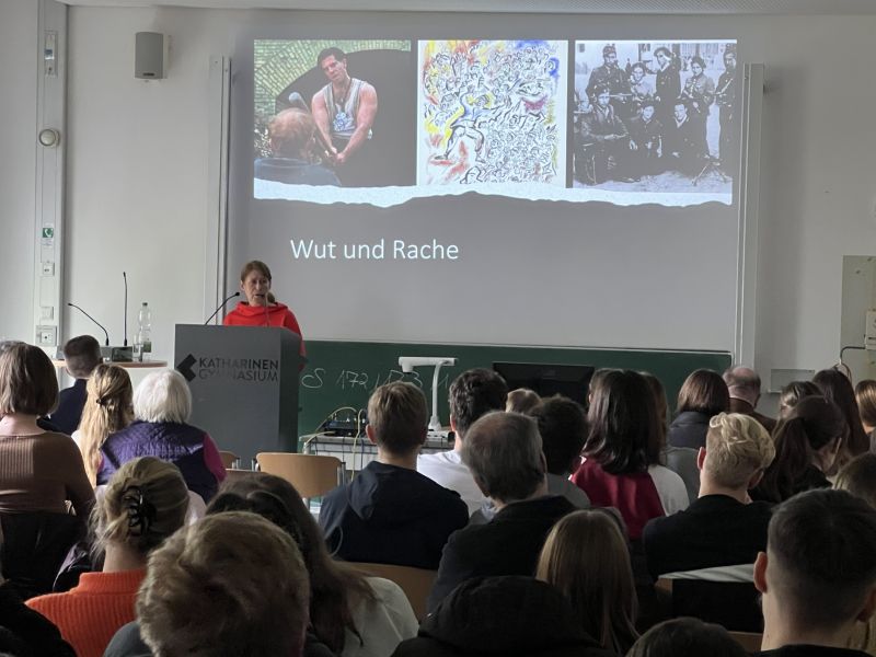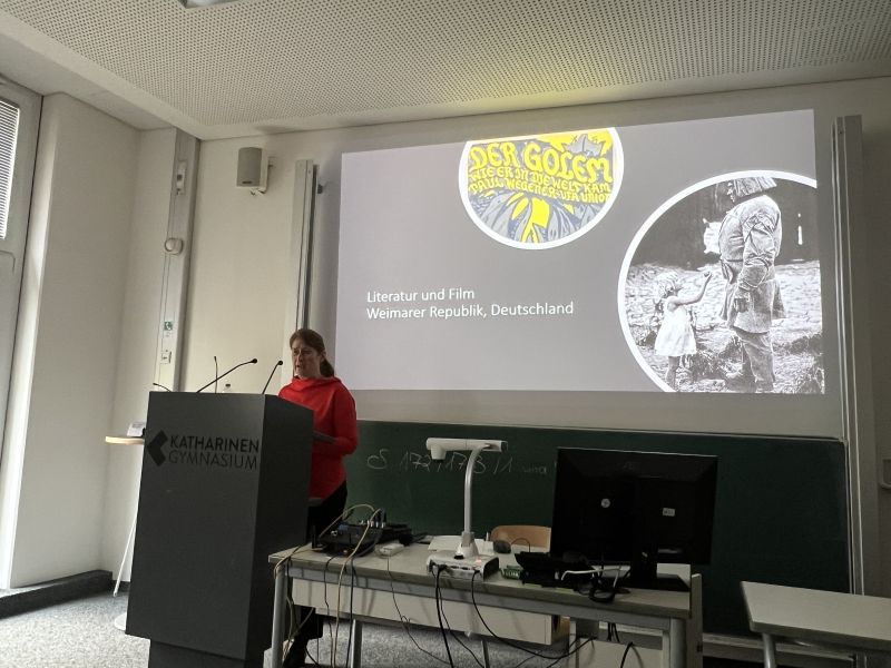 Am 27. Oktober referierte Frau Dr. Susanne Urban, die Leiterin der Recherche- und Informationsstelle Hessen vor SchülerInnen der Q11 und der interessierten Öffentlichkeit unter dem Titel "Menschenähnliches Wesen? Superheld? Vorläufer der Künstlichen Intelligenz? - Der Golem in der jüdischen Überlieferung" über die Rolle dieser mythologischen Figur im Judentum, aber auch über deren Nachwirkungen in Kunst und Film.