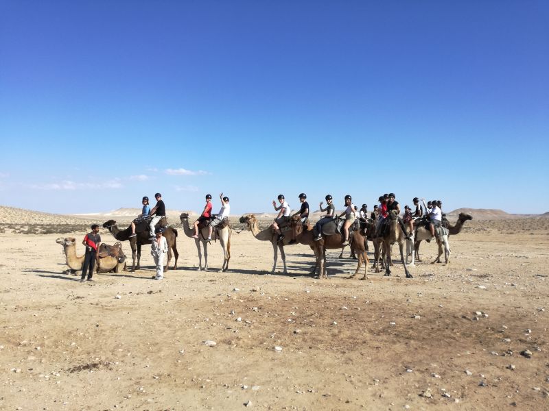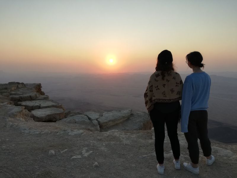 Unsere Austauschpartner lernten wir schon im Juli kennen und für den Gegenbesuch fing unsere Reise am Mittwoch vor den Herbstferien an. Nach dem Flug und einer abenteuerlichen Busfahrt von Tel Aviv nach Jerusalem wurden wir an der Schule von der israelischen Delegation empfangen. In den nächsten Tagen erwartete uns ein abwechslungsreiches Programm. Eines der größten Highlights erlebten wir schon in den ersten zwei Tagen: Ein Trip in die Wüste Negev! Hier schleppten wir uns für den Sonnenaufgang frühmorgens aus dem Bett, besichtigten eine Oase und, was nicht jedem ganz geheuer war, probierten uns mehr oder weniger erfolgreich am Kamelreiten. Mit einem Zwischenstopp am Toten Meer ging es am darauffolgenden Tag zurück nach Jerusalem. Um den Sabbat einzuläuten, konnten wir in den Gastfamilien das traditionelle Freitagsessen miterleben. Obwohl die meisten von ihnen nicht sehr religiös sind, ist es für sie trotzdem ein wichtiger Teil der Kultur.